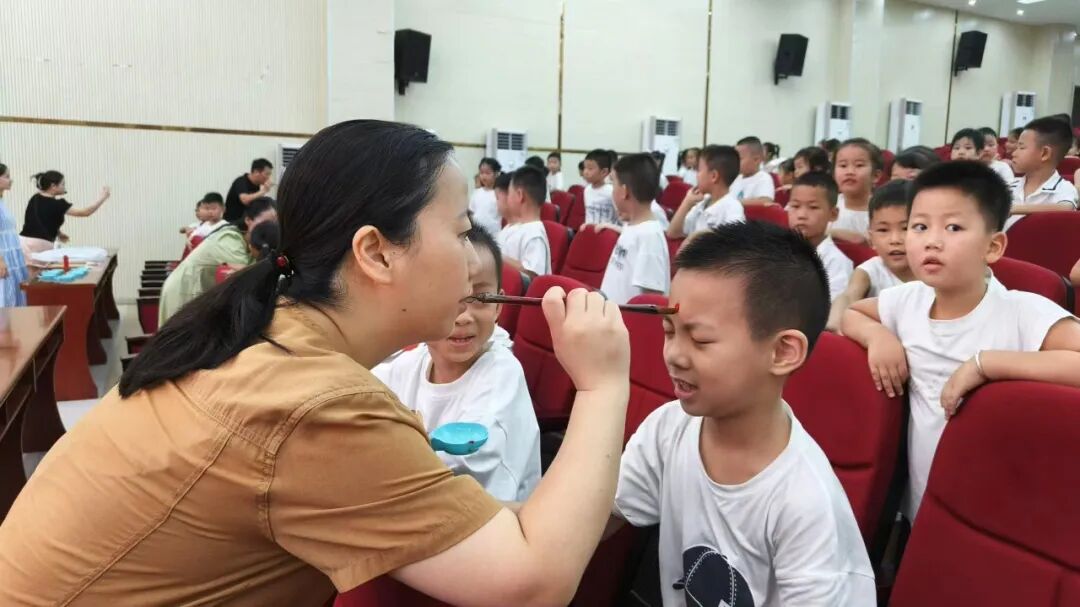 接著,“朱砂啟智”儀式開始。老師們莊重地手持毛筆,蘸取朱砂,輕輕在孩子們的額頭正中點上紅痣,寓意開啟智慧、目明心亮。這一傳統儀式不僅寄托了師長對孩子們的美好祝愿,更讓中華文化的種子在幼小的心靈中生根發芽。