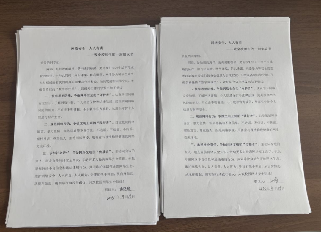 一份倡議,一份承諾。學校通過校園公眾號和班級群,向全校師生發出了《網絡安全倡議書》。倡議書從“守法上網、文明上網、安全上網、健康上網”等方面發出號召,引導大家爭做網絡文明的踐行者、網絡安全的守護者。這份倡議書得到了全校師生的積極響應,將網絡安全的理念延伸到整個校園,匯聚了共建清朗網絡空間的強大合力。
