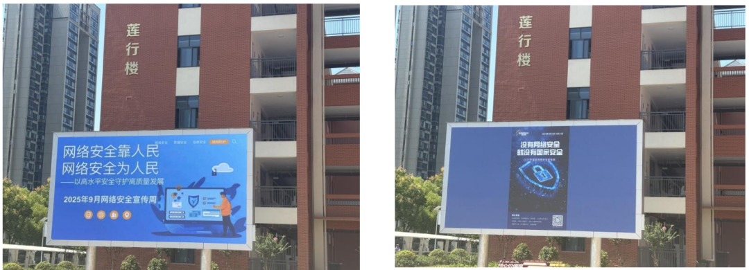 學校的電子大屏,循環播放精心設計的網絡安全宣傳海報和主題標語。以視覺化的方式無聲地浸潤著每一個人的心田,讓網絡安全觀念在潛移默化中成為校園文化的一部分。