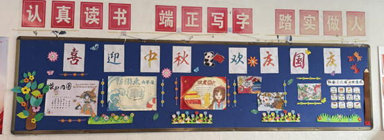 在一至三年級的教室,同學們在老師的指導下,充分發揮想象力與創造力,將普通話相關知識融入生動的畫面之中。四至六年級的同學們打造出了一批充滿家國情懷的黑板報作品。各班緊扣雙節特色,將中秋的團圓意蘊與國慶的愛國情懷巧妙融合。