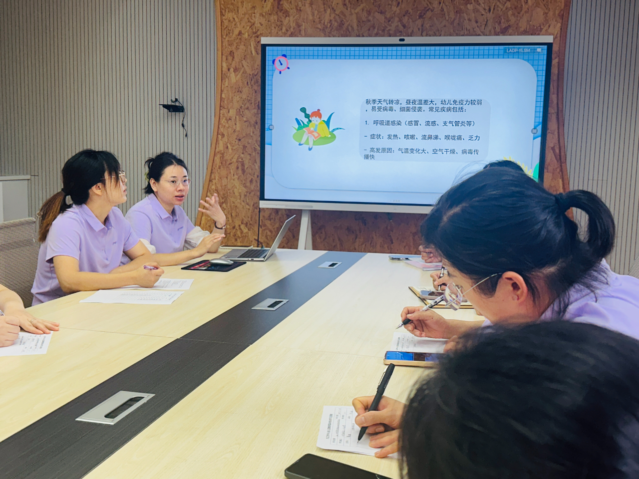 幼兒園專職保健醫生王琳、詹迪擔任主講人,她們圍繞秋季幼兒常見疾病的癥狀及發病原因展開系統性講解。從呼吸道感染的典型表現,到腹瀉的傳播途徑,再到手口足病的皮疹特征、過敏性鼻炎及哮喘的誘發因素,兩位醫師結合幼兒園日常案例,將每種疾病的核心癥狀、潛在發病風險進行了詳細的闡述,不但讓保育教師清晰掌握了疾病特點,更為后續將理論轉化為實際護理操作、提升工作實效奠定了堅實基礎。