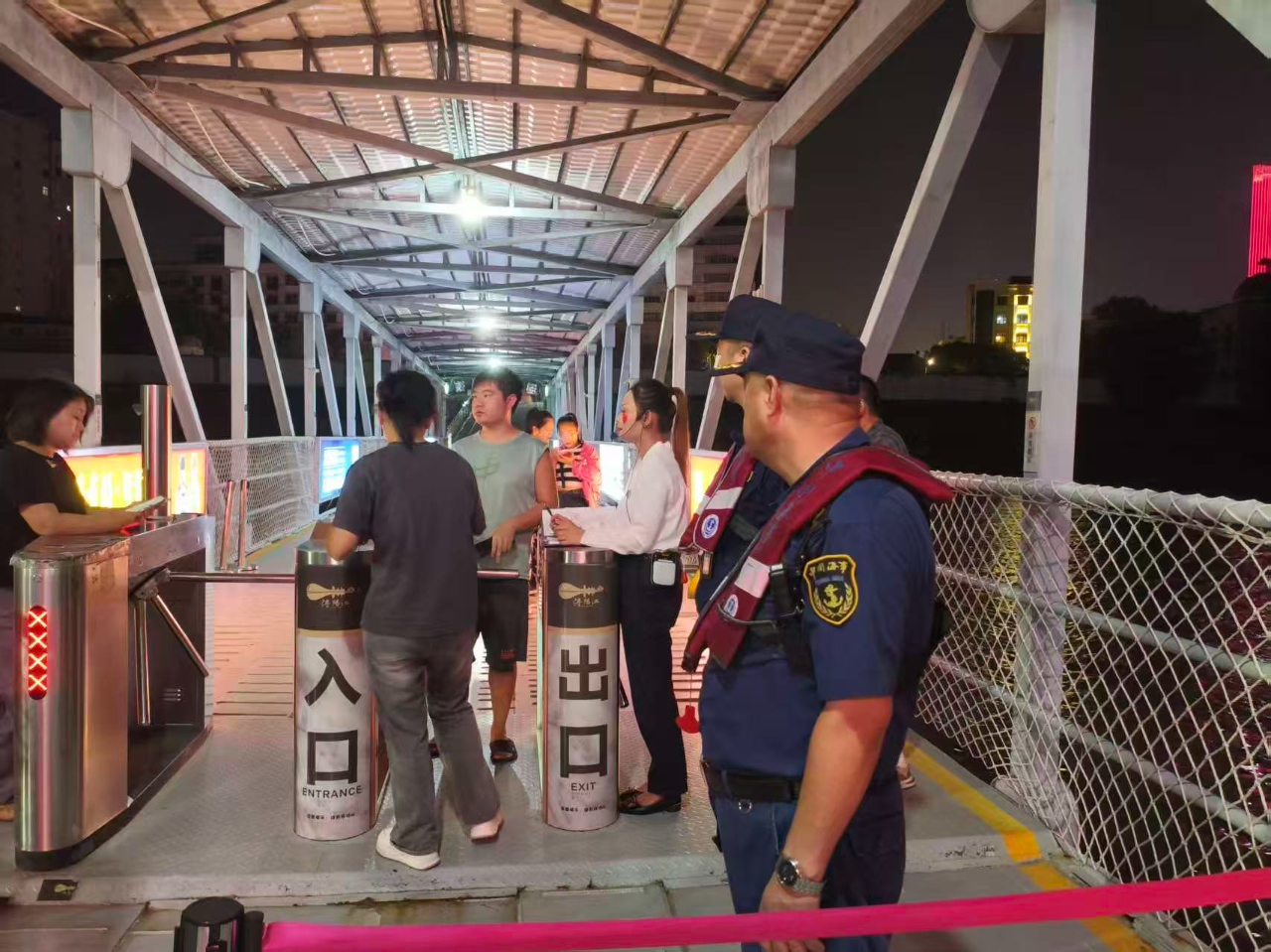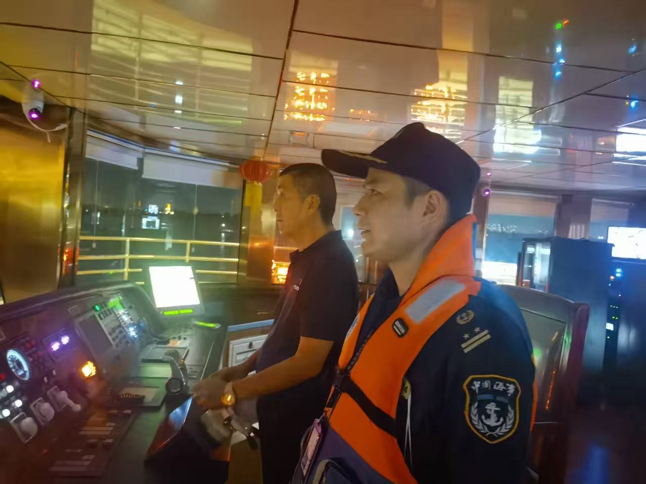 開航后,一名執法人員跟船監管,其他執法人員乘坐海巡艇現場護航。通過甚高頻播發航行警告,要求通過九江港區的上下水船舶注意瞭望,加強動態聯系。在“潯陽江號”通過九江長江大橋水域等重點水域時,執法人員點對點聯系進行動態抽查,督促其遵守橋區通航秩序。隨船監管執法人員在船提醒船方工作人員加強全船安全巡查,注意維護露天甲板及兩側走廊的乘客觀光秩序,避免發生人員意外落水。