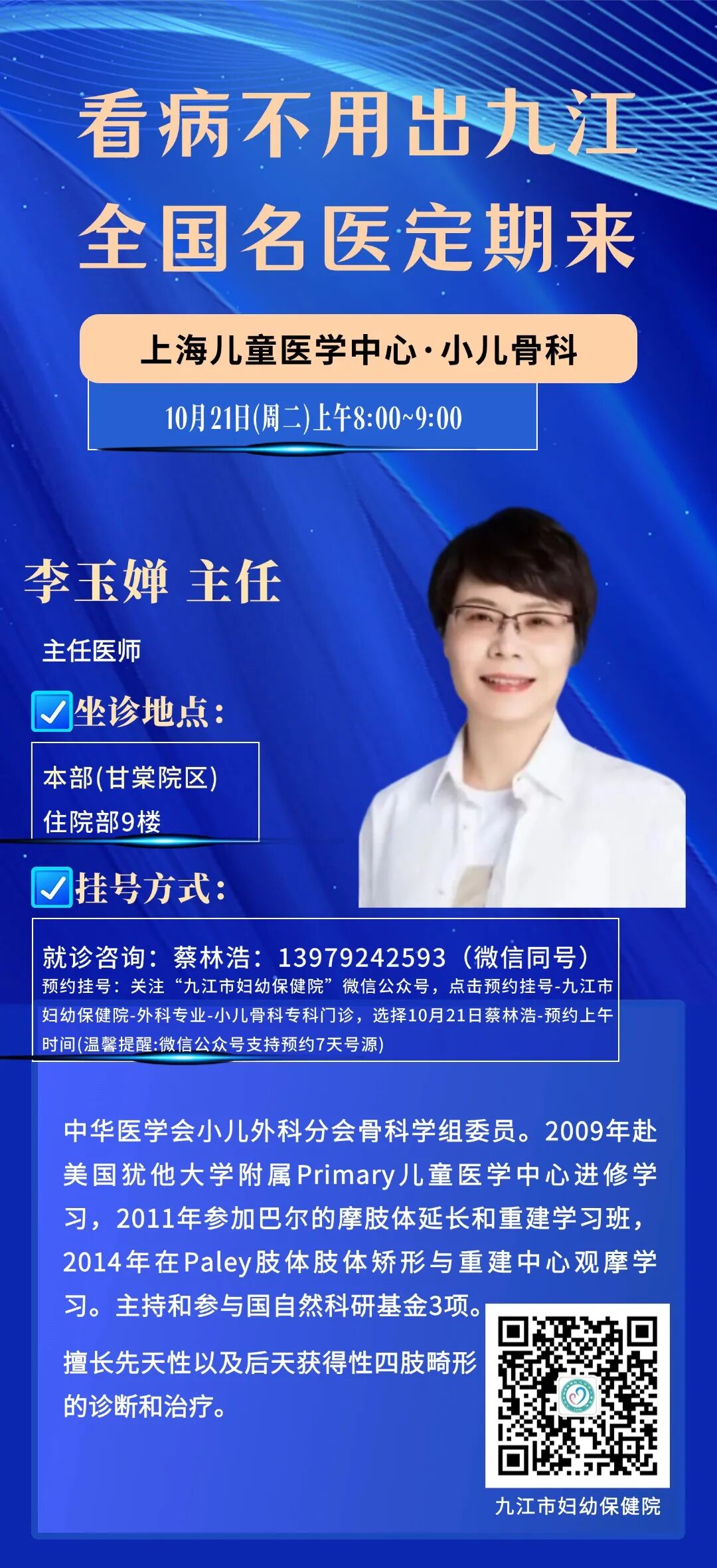 ?10月21日,上海兒童醫學中心小兒骨科專家到九江市婦幼保健院坐診、手術,有需要的可提前預約