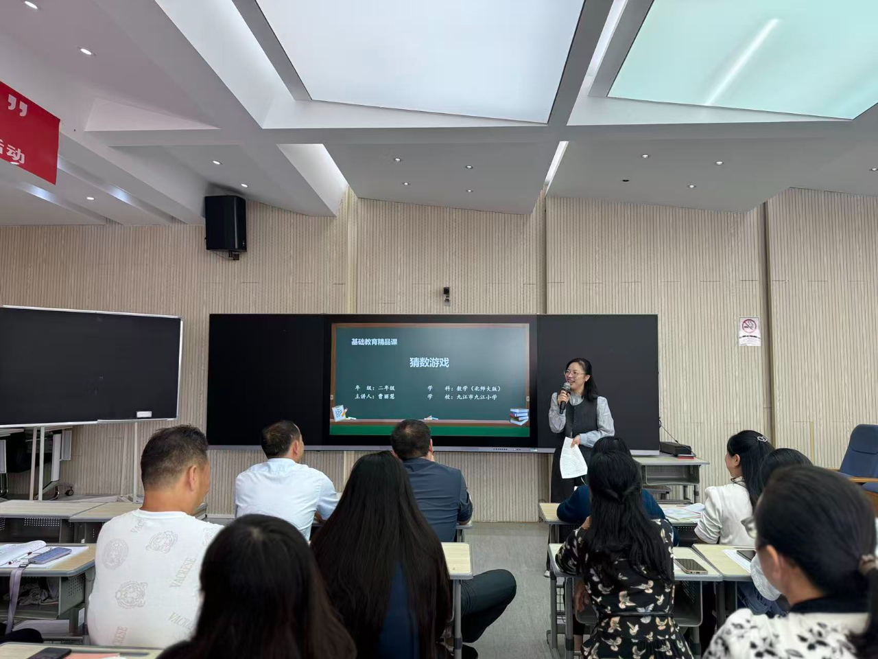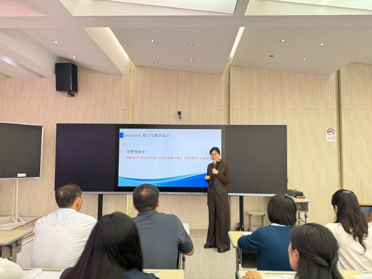 活動中,數學教師向秋玲帶來了“AI賦能小學數學課堂”的專題培訓,向老師深入淺出地講解了如何使用人工智能軟件制作教學設計和課件,為今后的教育工作提供了新的方法和途徑。隨后,曹麗慧老師結合執教課例《猜數游戲》,向大家演示AI工具在教學中的實際應用。