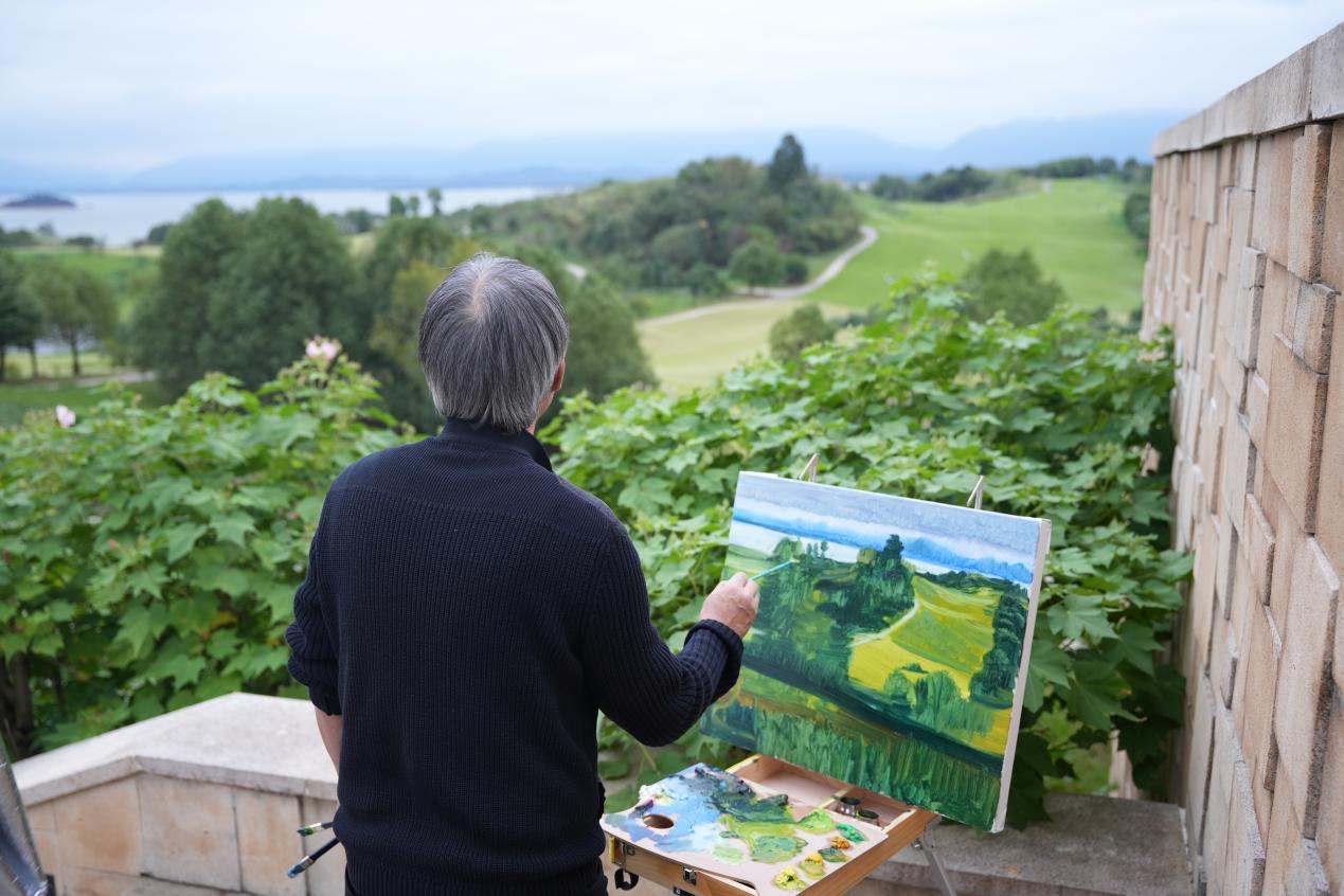 采風活動中,30位漆畫名家先后走進瑤池灣國際垂釣中心、思無邪民宿、沃森鄉村俱樂部等地,開啟了一場沉浸式的創作之旅。大家乘船悠然游湖,近距離領略碧波萬頃、清澈寧靜的湖面風光,感受“滄海一樹”遺世獨立的獨特韻味。漆畫家們靈感涌現,紛紛現場作畫,用畫筆記錄西海千島如珠落玉盤的壯美景色。
