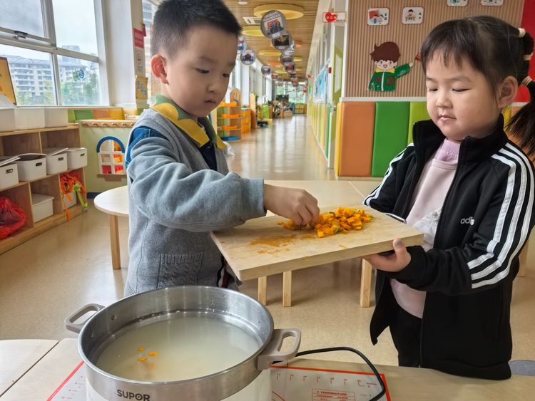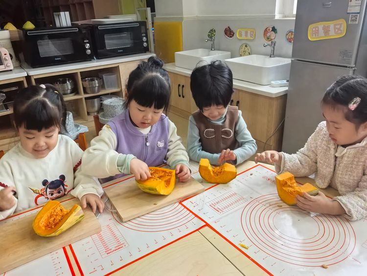 食育坊里飄來陣陣香氣,孩子們正圍在操作臺旁忙碌著。在老師的指導下,大家小心翼翼地搓洗南瓜,削皮,切南瓜,體驗煮南瓜粥的樂趣;或是用面團壓出月餅,在動手實踐中感受糧食的多樣形態。
