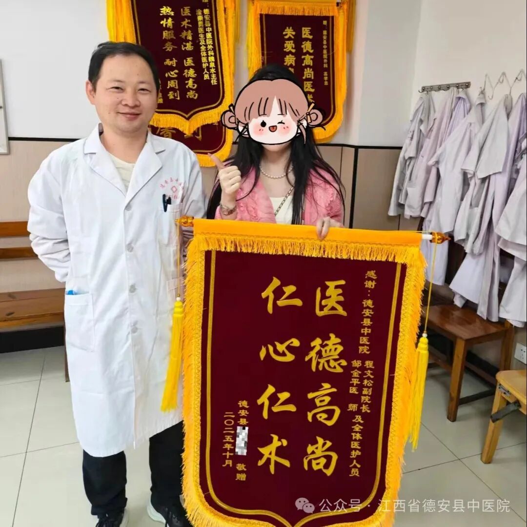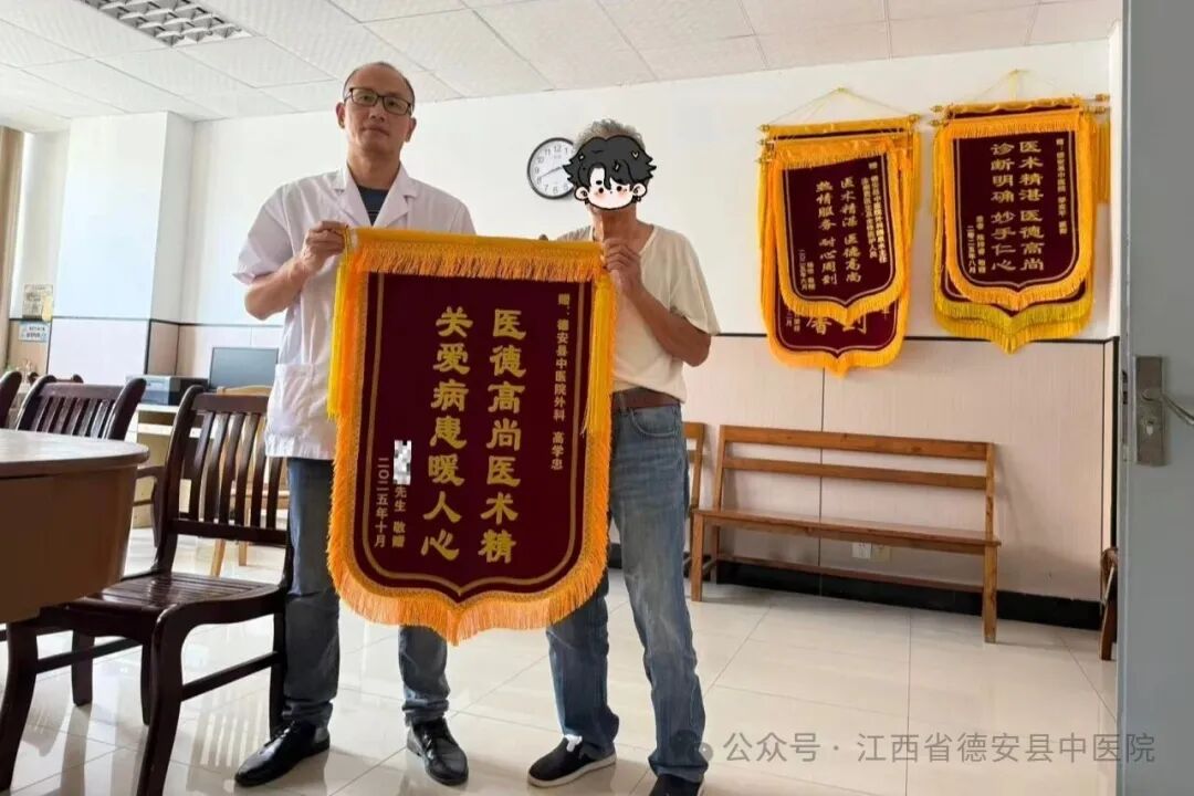 九江新聞網訊(金佳佳)近日,康復出院的76歲患者李某(化名)與30歲患者袁某(化名),分別帶著飽含感激的錦旗找到德安縣中醫院外科主管醫生,用最質樸的方式表達謝意。這樣的醫患溫情事例在該院時有發生,每一面錦旗背后,都是醫生用專業與責任守護健康的動人故事,更印證了醫院中西醫結合診療模式的顯著成效。
