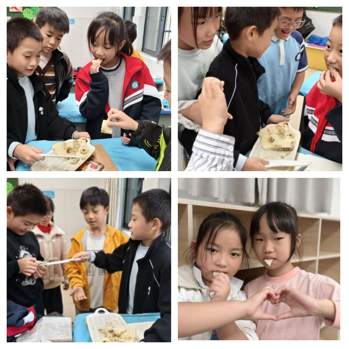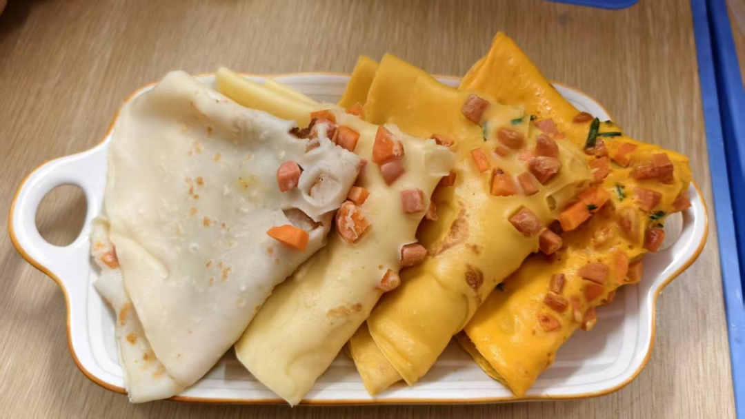 當盤子里堆滿形態各異卻同樣誘人的雞蛋餅時,“分享盛宴”正式開啟!你嘗我的火腿餅,我咬你的蔬菜餅,教室里滿是咀嚼聲與贊嘆聲。
