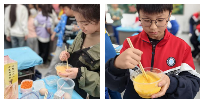 打蛋液、混面粉、加牛奶……同學們組隊開啟“攪拌模式”,筷子在碗中飛速旋轉,蛋液與面粉逐漸交融,偶爾濺出的小面糊,也成了課堂里的“快樂音符”。