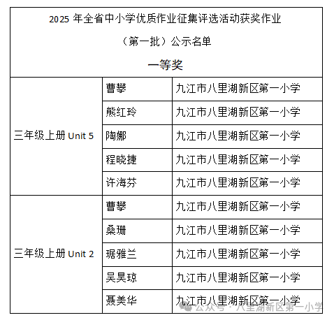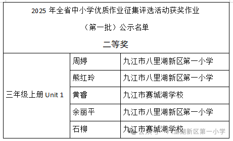 九江新聞網訊(熊紅玲)在近日公布的 《2025年全省中小學優質作業征集評選活動獲獎作業(第一批)公示名單》中,八里湖新區第一小學英語教師團隊憑借出色的作業設計與創新實踐,在激烈的競爭中脫穎而出,斬獲兩項一等獎、一項二等獎的好成績。