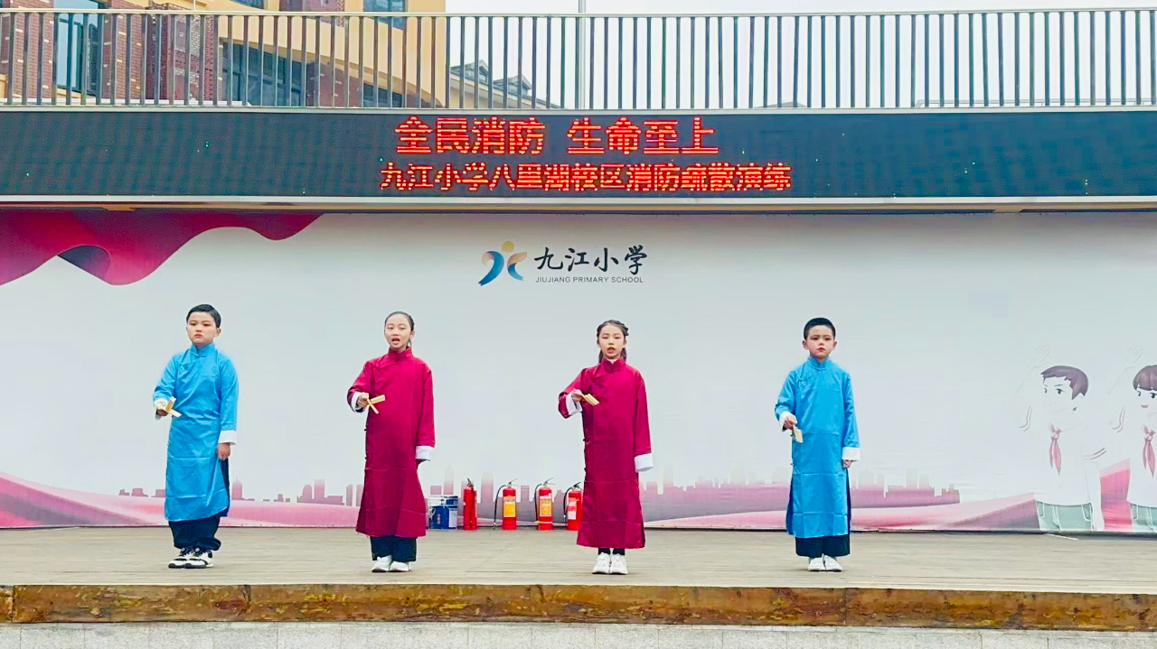 當(dāng)日8時(shí)30分,消防演習(xí)正式開(kāi)始。隨著警鈴聲響起,學(xué)生們用毛巾捂住口鼻、彎腰行進(jìn),在老師的帶領(lǐng)下迅速、有序地疏散到操場(chǎng)安全地帶。演練結(jié)束后,四(4)班的孩子們走上舞臺(tái),開(kāi)展以“全民消防,生命至上”為主題的晨會(huì),四名少年以朗朗上口的快板詞,宣傳消防小秘訣。