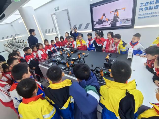 在參觀環節,同學們的目光被各類智能設備牢牢吸引:會跟著音樂節拍靈活跳舞的機器人、動作舒展連貫的“太極機器人”,讓大家忍不住駐足觀看、拍手叫好;靈活穿梭的機器狗時而轉身、時而跳躍,引得同學們圍上前近距離觀察,好奇地詢問其運動原理;而汽車模擬生產線則直觀展示了自動化生產的流程,讓大家對工業科技有了全新認知。同學們臉上洋溢著興奮與好奇,不時與同伴分享體驗感受,現場氛圍熱烈。