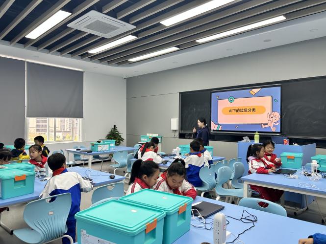 參觀結束后,大家按組別進入四個教室,開啟深度實踐課程。在“AI下的垃圾分類”課堂,同學們學習如何借助人工智能技術高效分辨各類垃圾,在互動中樹立環保與科技結合的新認知;“編程中的數學之美”課堂將編程與數學知識巧妙融合,孩子們在趣味編程實踐中發現數學的實用與趣味;“地表水質無線智能監測站”課程則帶大家探索人工智能在環境監測領域的應用,明白科技對守護生態的重要意義。“無人機課程”中,大家先學習飛行原理與安全規則,再親手操控無人機完成起飛、懸停、轉向等基礎動作,小心翼翼地操作成功后的歡呼,成為課堂上最動人的畫面。
