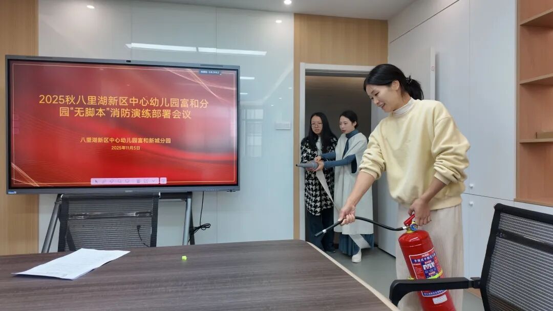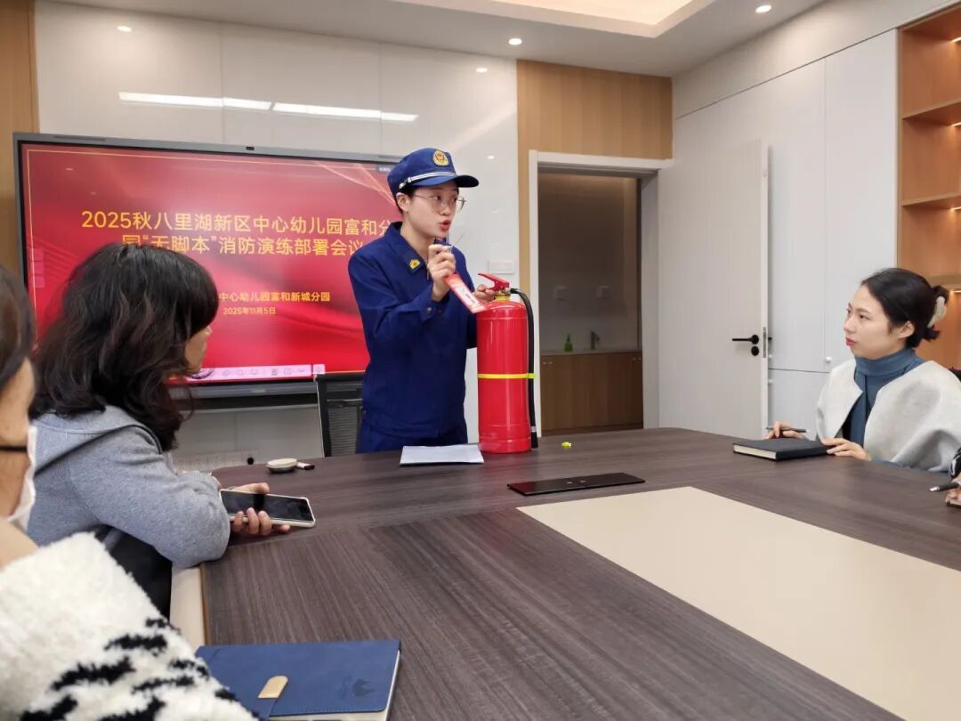 11月5日上午,八里湖新區(qū)中心幼兒園富和新城分園特別邀請(qǐng)八里湖新區(qū)消防救援大隊(duì)消防人員走進(jìn)校園,開(kāi)展無(wú)腳本消防應(yīng)急演練。演練前,園長(zhǎng)蔡娜對(duì)消防演練進(jìn)行了部署,明確目標(biāo)要求,落實(shí)教職工職責(zé)。接著,消防宣講員進(jìn)行手把手指導(dǎo)老師們實(shí)操演練。從滅火器的“提、拔、握、壓”四步使用法,到消防栓的連接、出水操作,每一個(gè)動(dòng)作都細(xì)致講解、反復(fù)糾正,確保老師們熟練掌握應(yīng)急滅火技能,成為孩子們身邊最可靠的“安全防線”。
