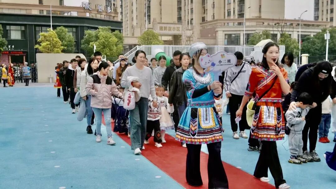 6個(gè)班級(jí)方陣的孩子們身穿極具特色的民族服飾在老師們的帶領(lǐng)下有序進(jìn)場(chǎng),孩子們與家長(zhǎng),喊著響亮的口號(hào),展現(xiàn)了朝氣蓬勃的精神面貌。