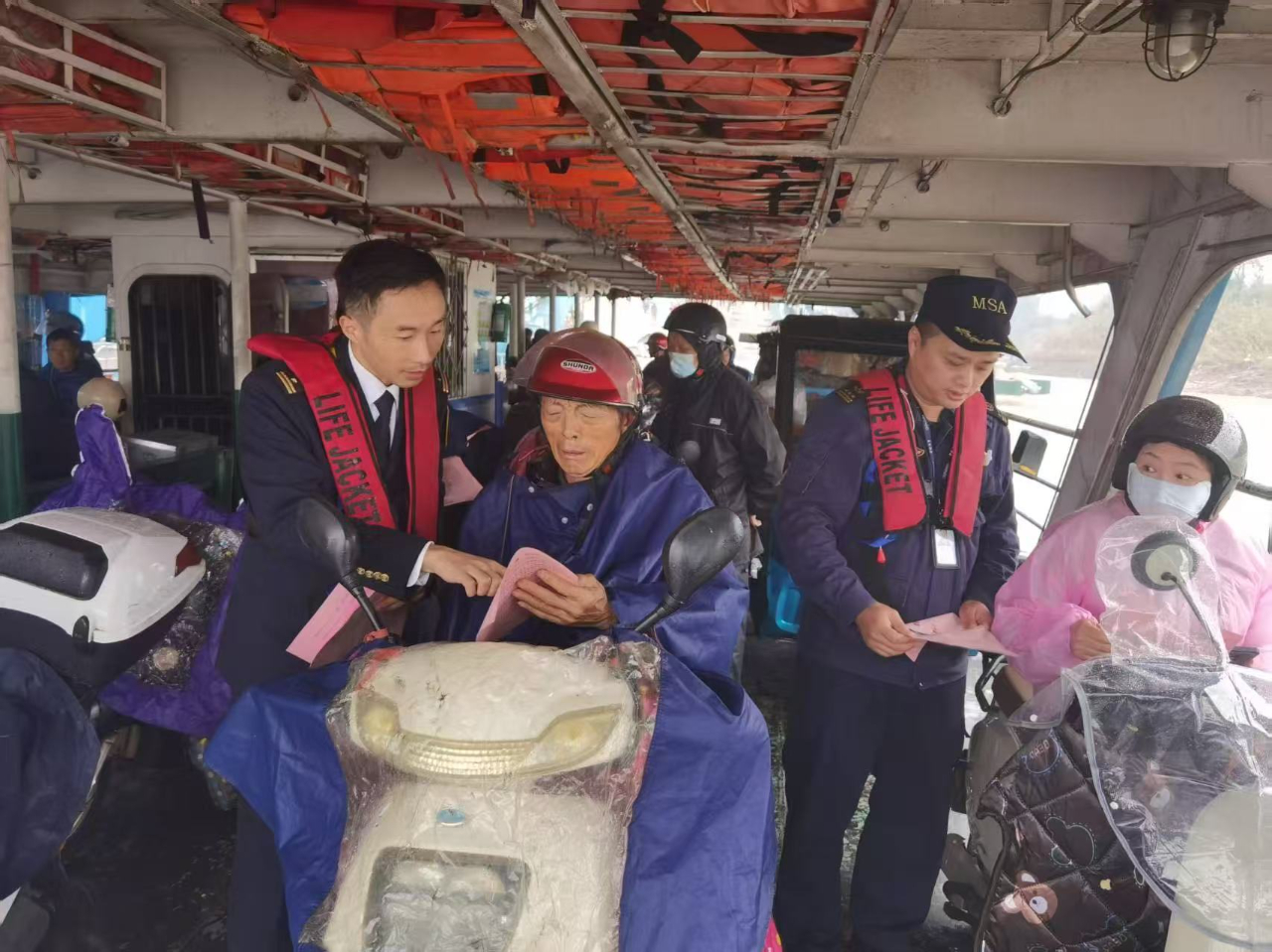 執法人員走上船頭開展宣傳教育,為乘船群眾發放了水上安全宣傳單,并普及渡運安全相關法律法規、水上應急救助常識等渡運安全知識,以提升社會公眾和渡船船員的渡運安全意識,營造人人關注渡運安全的良好氛圍。